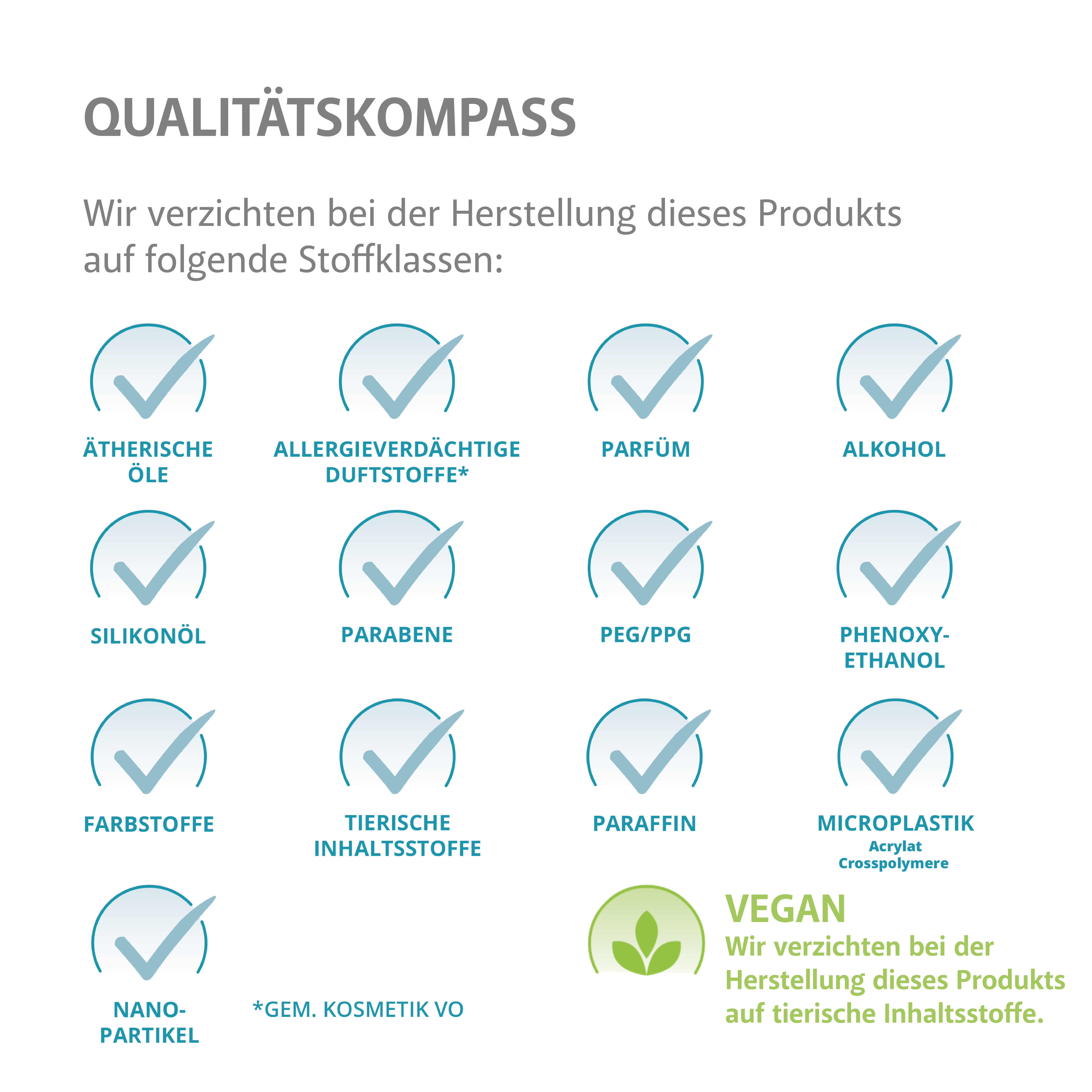 Ätherischen Ölen, Allergieverdächtigen Duftstoffen, Parfüm, Alkohol, Farbstoffen, Tierischen Inhaltsstoffen, Silikonöl, Parabene, PEG/PPG, Phenoxyethanol, Mikroplasik, Nano-PartikelIngredients: